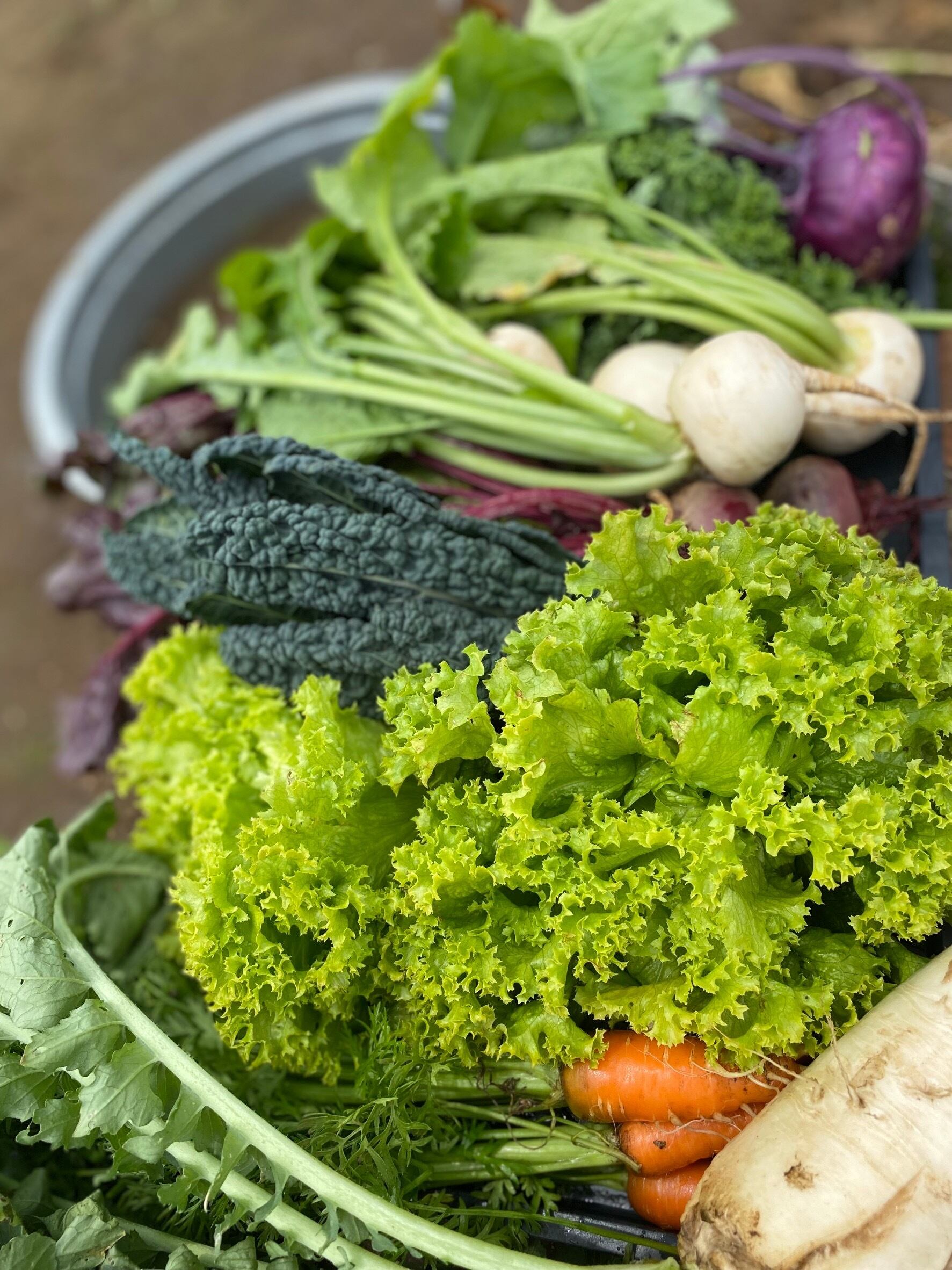 ・現在お届け可能な野菜は、さつまいも、さといも、じゃがいも、ルッコラ、ラディッシュ、スティック春菊、リーフレタス、わさび菜、ケール、ほうれん草、キャベツ、ブロッコリー、白菜、大根、かぶ、にんじんです。